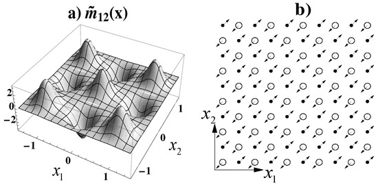 The magnetization vector of the more stable HF state determined here lies in the direction 1-2. a) This figure shows the projection of the dimensionless magnetization, in the 1-2 direction. The magnetization unit is . b) The picture shows a scheme of the mean magnetic moment per site in the lattice. The modular value for the shown solution is 0.67.