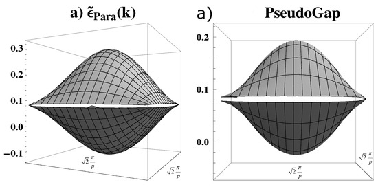 In Section 1 we had already commented about LaCuO and its antiferromagnetic and insulator properties at zero hole doping. However, at an intermediate level of doping, this material presents alternative special properties. After the breaking of the antiferromagnetic order and within certain temperature T and doping ranges, the material transits to phases indicating the presence of gaps with strength depending of the position along the Fermi surface (pseudogaps) [15,35]. Two types of such pseudogaps had been already detected by experiments: the and the ones, indicated by their characteristic temperatures of appearance: and , respectively. In the LaCuO and other HTc materials the presence of these properties has been observed in some regions of their paramagnetic PM and superconductor SC phases [14]. It should be noticed that the physical nature of the pseudogap phenomena is yet not fully understood. There exist various proposals for explaining its physical origins [15,38]. In this paper we adopt a definition of the pseudogap as a momentum dependent excitation gap existing along the Fermi surface of the system [15]. The presence of this gap clearly means a depletion of the density of states around the Fermi surface, which is another way to describe the concept [38]. As mentioned above, the experimentally detected pseudogaps are characterized by the fact that the measured gap is higher when the electrons travel parallel to the Cu-O bonds.
