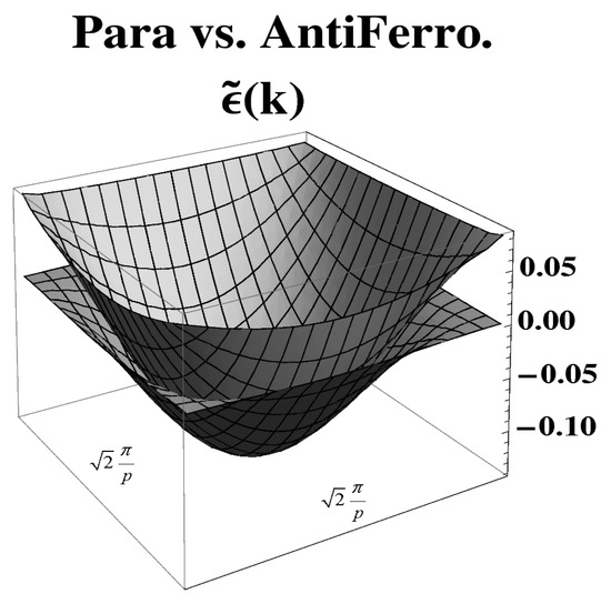 Let us illustrate in this subsection how the removal of the translational symmetry restrictions over the HF orbitals (but not the one fixing the spin projection to be ) allows to obtain another paramagnetic HF state. This solution shows features also exhibited by the above mentioned pseudogap states of HTc superconductor materials in their normal states. In Figure 7 the band spectra corresponding to this HF paramagnetic state obtained from Eq. (15) is shown. Note the existence of a pseudogap which reaches a maximum value of (equivalent to 0.012 dimensionless unit of energy ). The parameters given in the Subsection 4.2 were employed for this evaluation. Taking into account that this result corresponds to half filling (that is, with the extreme underdoping limit ) the maximal value of the gap at the mid points of the Billouin zone sides, furnishes an estimate of for the temperature at which a pseudogap starts to be observed in the experiments. It should be noticed, that the evaluated maximal gap magnitude depends on the effective dielectric constants and the set of parameters (among them ) which were fixed to reproduce the Matheiss single band crossing the Fermi level [22]. Therefore, the result for should not be taken as a precise prediction of any of the two pseudogap temperatures under current consideration. However, the experimental results of ARPES in doped LaCuO indicated a value of so called pseudogap temperature in the region , precisely in the here studied extreme underdoped limit [15,35,36,37,38]. Therefore, the PPG Hartree-Fock solution gives a reasonable estimate for the upper pseudogap temperature parameter.