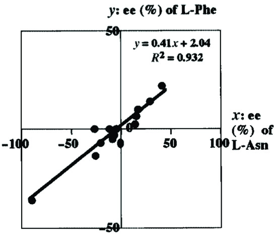 Plot of ee values of L-phenylalanine (L-Phe) and L-asparagine (L-Asn) of crystals obtained from recrystallization of D,L-Phe (300 mg) in the presence of D,L-Asn (2.1 g). The ee values of Asn (x-axis) and Phe (y-axis) for each sample were plotted as (λ) [30].
