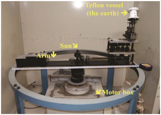 We constructed a model of the earth about 20 years ago (Figure 3). The radius of the arm was 30 cm. The inner diameter of a Teflon vessel was 4 cm, and the height of its inner cavity was also 4 cm. This vessel revolves three times around its axis per one rotation around the sun (center) using a motor and gears (Video 1). The maximum rotation speed was 150 rpm. Unfortunately, we have not succeeded in inducing appreciable ee in oxidation of methyl p-tolyl sulfide with sodium periodate, epoxidation of stilbene with m-chloroperbenzoic acid, or solvolysis of 1-chloro-1-phenyl-ethane with this model. To avoid the effects of side products, we determined the ee by HPLC, in which the standard deviation is usually ~1%–2%. Therefore, an ee smaller than 1% could not have been detected even if it had arisen. Recrystallization of D,L-Asn with this model gave crystals with either plus or minus ee and did not give only L- or D-rich crystals, showing that the results were similar to those obtained by recrystallization made in a stationary vessel. At present, no experimental evidence is available indicating that the asymmetric movement of the earth causes homochirality of amino acids.