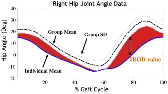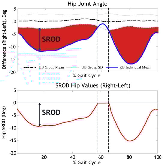 We developed a technique that we refer to as Regions of Deviation (ROD) analysis to provide quantitative metrics to describe and compare motion patterns in gait [51]. This approach can be used to evaluate deviations in symmetry between bilateral joints or deviation of an individual joint relative to healthy normative behavior. ROD analysis consists of two measures: Symmetry Regions of deviation (SROD) and Individual Regions of Deviation (IROD).