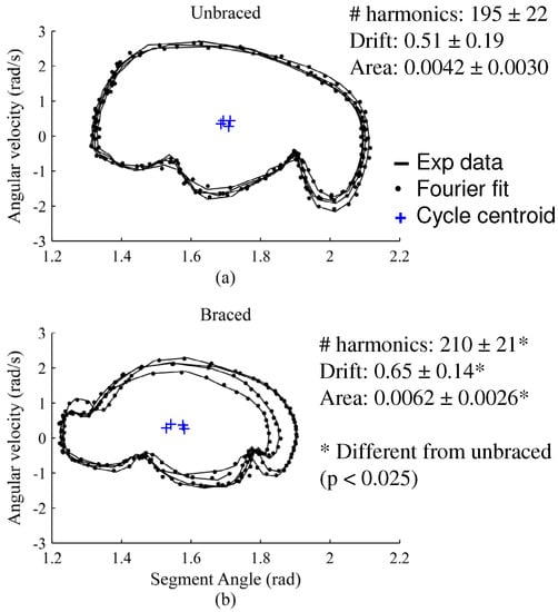 Phase portraits of right thigh during normal unbraced and braced walking over four cycles. Values for complexity (# harmonics) and variability (drift and area) for 20 consecutive gait cycles for 20 healthy male subjects, derived from results in [52].