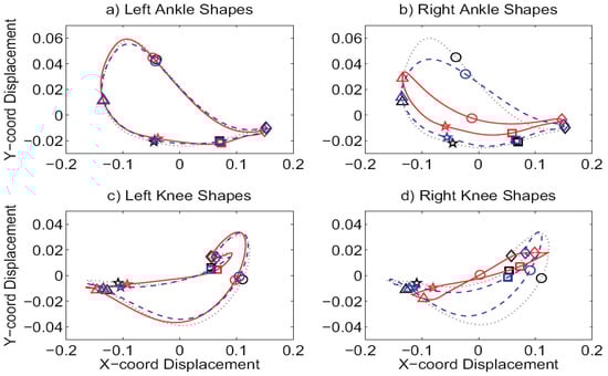 Average (over subjects) gait cycle shapes in the non-braced (black dotted), knee-braced (red solid), and ankle-braced (blue dashed) conditions after alignment with GPA consensus. The symbols square, star, triangle, circle, and diamond represent 20%, 40%, 60%, 80%, and 100% of the gait cycle, respectively.