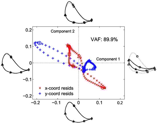One of the principal advantages of PARAFAC is that it allows identification of the time points during the gait cycle that are most responsible for explaining the effect of gait perturbations. Figure 6 illustrates the magnitude and direction of the residual deviations for the ankle motion when individuals wear a knee brace on the right side compared to the normal non-braced condition. Wearing the knee brace results in a flatter motion profile for the ankle. During stance phase (i.e., along the bottom of the idealized profile), the braced trajectory is slightly elevated relative to normal; while during swing phase, the braced trajectory does not extend as far upward as the normal profile. The magnitude of this effect is illustrated in the plots of x and y residuals. For example at 80% of the gait cycle (denoted by circles in Figure 6), the y coordinate shows high negative weights along component 1, while the x residual shows positive weights along component 1. Component 2 explains the effect of the right knee brace on the contralateral ankle motion (Figure 5). The perturbation here largely results in an increase in the height of the ankle during swing, as noted by the high positive y residuals on component 2.