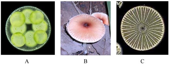 Spherical and circular symmetries. A. Volvox (© www.micrographia.com). B. Cap of a mushroom. C. Centric diatom. (© www.micrographia.com).