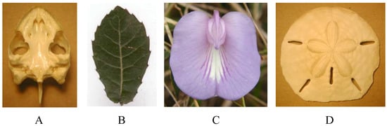 Bilateral symmetry. A. Skull of a turtle. B. Leaf of Quercus calliprinos. C. Flower of Clitoria. D. Sand dollar.