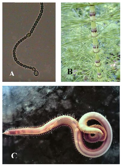 Translational symmetry. A. Filament of a cyanobacterium, Nostoc (Ashwani K. Rai, Department of Botany, Banaras Hindu University). B. Internodes of a horsetail, Equisetum arvense (Eric Guinther, public domain). C. Metameres of the polychaete Glycera (NOAA Photo Library).