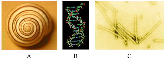 Helical symmetry. A. The snail Cepaea nemoralis. B. DNA double helix (Richard Wheeler [Zephyris], http://en.wikipedia.org/wiki/DNA). C. Tobacco mosaic virus (Agricultural Research Center, USDA, at http://emu.arsusda.gov/typesof/pages/tmv2.html).
