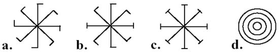 An n-dimensional object is mirror (i.e., bilaterally) symmetric if it is invariant under a reflection about a hyperplane of dimension (n − 1) passing through the object’s center of mass. Thus a 2-dimensional object is mirror symmetric if it is invariant under a reflection about a line (the mirror-symmetry axis) (Figure 7b), and a 3-dimensional object is mirror symmetric if it is invariant under a reflection about a plane [,]. A 2-dimensional object has rotational symmetry of order n if it is invariant under rotation of radians about the symmetry center of the object (Figure 7a). A 3-dimensional object has rotational symmetry of order n if it is invariant under rotation of radians about an axis passing through the center of the object. This axis is the rotational symmetry axis. Rotational symmetry of order n is denoted -symmetry. Dihedral symmetry is the symmetry of a 2-dimensional object having both mirror symmetry and -symmetry (such objects have 2n axes of mirror symmetry) (Figure 7c). Dihedral symmetry of order n is denoted -symmetry. Radial symmetry is C∞ -symmetry (see Figure 7d). It differs from rotational and dihedral symmetries because the number of rotational and reflective axes of symmetry is infinite. An object displays translational symmetry if each of its segments is equal to the other segments of the object located at equal translational distances [].