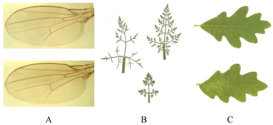 Three types of objects for quantifying metric asymmetry. A. Structures having consistent topology and number of landmarks (Drosophila melanogaster wings). B. Structures having consistent topology, but varying number of corresponding landmarks among specimens (the secondary veins of Daucus carota leaves). C. Variable structures having no consistent topology, no quantitative consistency, and sometimes no matching points (lobes and sinuses on the leaves of Quercus alba).