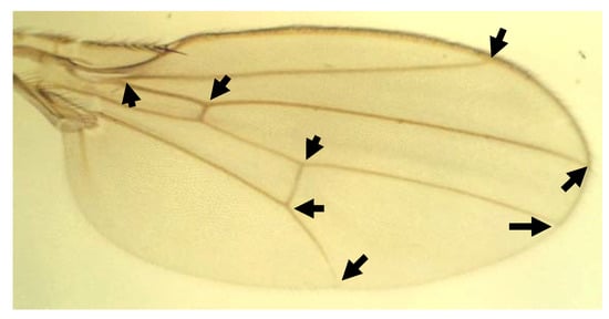 The right wing of Drosophila melanogaster. The arrowheads point to the landmarks.