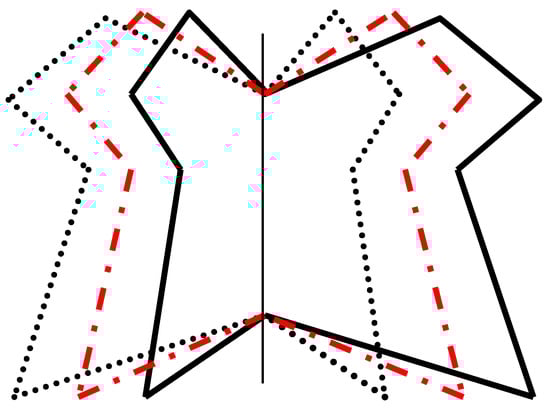 Asymmetry of eight landmarks. The diagram shows the original configuration (solid black) and its reflected and relabeled copy (dotted black), after least-squares Procrustes superimposition. The Procrustes average (dashed-dotted red) is perfectly symmetrical. (Adapted from []).