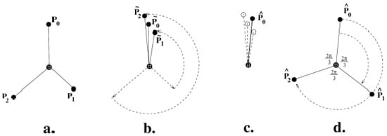 The folding-unfolding algorithm applied to a single orbit (from []). CSM with respect to rotational symmetry of order 3 is calculated. The points are associated with the rotations , respectively: a) Original 3 points . b) Fold – apply the inverse symmetry element to each point (i.e., rotate by ). Points are obtained. c) Average – points are averaged, obtaining d) Unfold – apply the symmetry elements to average point (i.e., rotate by ), obtaining points ). CSM is calculated: CSM = .