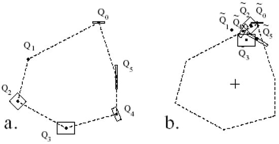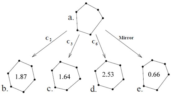 An example of the algorithm is shown in Figure 15, for a single orbit of the C3 symmetry group, namely, the rotational symmetry group of order 3. For a set of orbits, we calculate the CSM independently for every orbit, with the appropriate symmetry operation applied about the center of mass of all points rather than about the origin. This algorithm can be implemented for all symmetry groups in any dimension. Proof and details can be found in [,,]. An example of a hexagon and its CSM value and symmetry transform for various symmetry groups is given in Figure 16.