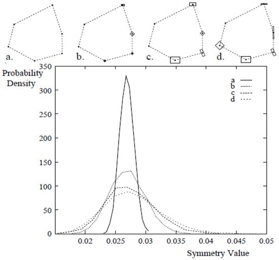 Klingenberg and colleagues [] have suggested a measurement for quantifying object symmetry via landmarks. We illustrate their approach with ten landmarks (Figure 14, vertices). The vertical line defines the single axis of symmetry, whereas the remaining eight vertices are in four pairs on right and left sides. The diagram shows the original configuration (solid black line). The procedure consists of three steps: