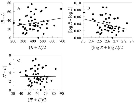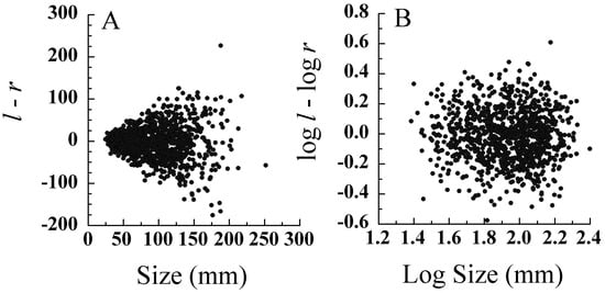 Before proceeding further, one should verify that the asymmetry is fluctuating asymmetry, and not a broken symmetry, such as directional asymmetry or antisymmetry [,]. Ordinarily, fluctuating bilateral asymmetry is symmetrically distributed about a mean of zero. Directionally asymmetric traits will have a mean other than zero, and antisymmetric traits will have either a platykurtic or bimodal distribution about a mean of zero. Directionally asymmetric and antisymmetric traits should be studied separately [,]. In fact, Graham et al. [] and Van Dongen [] have developed methods for either removing the directional component or decomposing a mixture distribution into fluctuating, directional, and antisymmetric components.