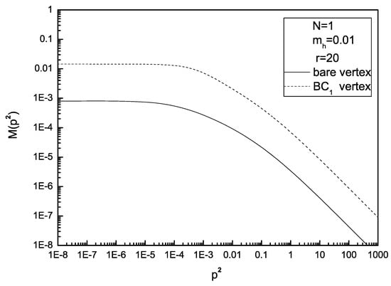 Here it is interesting to look at the quantitative impact of refining the truncation scheme used in this paper. In order to show a comparison of our result with that of the bare vertex approximation, in Figure 1, taking the case as an example, we draw the curves of the mass function versus for and for both the bare vertex and the BC1 vertex ansatz. It can be seen that for both the bare vertex and the BC1 vertex ansatz, the mass function almost remains constant for small , and decreases monotonously with increasing after reaches a certain value. In the whole range of , the mass function obtained using the BC1 vertex is much larger than that obtained using the bare vertex. This shows that the dressing effect of the fermion-photon vertex is very important in the study of dynamical mass generation in the Abelian Higgs Model in dimensions. In addition, due to the fact that increasing gauge boson mass weakens the attractive force between a pair of fermion and antifermion, the larger infrared value of the mass function for the case of BC1 ansatz implies that the critical gauge boson mass for the case of BC1 ansatz should be larger that the one for the case of bare vertex.