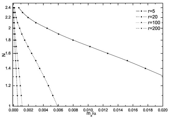 In Figure 2, the variation of on for several values of the ratio r is shown. From the obtained numerical results one finds that DCSB is completely suppressed when exceeds a critical value for a fixed number of fermion flavor N (here the mass terms are scaled by ). From Figure 2 one finds that decreases monotonically with the gauge boson mass increasing for fixed value of r and it decreases monotonically with the Ginzburg–Landau parameter r increasing for fixed value of . It can be seen that the corresponding critical number of fermion flavor is about 2.4 when the gauge boson mass tends to zero. So the originally massless fermion acquires a dynamical mass (the physical number of fermion flavor ). But in Figure 2 the curve is steeper and for the same value of and r, is much larger than the value of []. In fact, for and , we find that the critical gauge boson mass is too small and DCSB can be hardly observed when we numerically solve the coupled DSEs by means of iteration method using the bare vertex ansatz. Here we note that QED3 theory (and its generalization to the Abelian Higgs model) with is employed as an effective continuum theory for the 2D quantum antiferromagnetic (Neel) ordering corresponding to dynamical fermion mass generation [,,,]. So a reliable value of the critical number of fermion flavors is important for the study of dynamical fermion mass generation and chiral symmetry breaking.