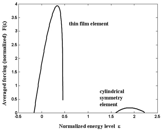 Averaged forcing (normalized, unitless) versus normalized energy level for thin film magnetic element and magnetic element with cylindrical symmetry. The averaged forcing is significantly larger for thin film element.