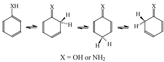 In the case of simple six-membered rings with one exo-OH or NH2 group (Scheme 2), aromaticity seems to be also the principal factor that dictates the tautomeric preferences (Table 14). For phenol, the hydroxy tautomer is favored [55,57]. This form is well delocalized due to cross n-π conjugation of the exo-OH group with the π-π conjugated phenyl ring. The HOMED index is close to 0.9 for the whole tautomeric system including the exo-OH group (seven bonds). The same is true for aniline. The well delocalized amine tautomer is favored. In this form, the exo-NH2 group is cross n-π conjugated with the π-π conjugated phenyl ring. The HOMED index is close to 0.9 for the whole tautomeric system including the exo-NH2 group (seven bonds). When the C atoms take the moving proton in phenol and aniline, they lose the sp2 state of hybridization. The rare CH tautomers are non-aromatic (HOMED close to 0.5). They are considerably less delocalized than phenol and aniline due to weaker mixed conjugation (σ-π and π-π).