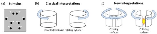 Perceptual interpretations of the symmetric structure-from-motion (SFM) stimulus in []. (a) Sketch of the physical stimulus, a dot pattern symmetric about the vertical midline. As the arrows indicate, symmetric dots move in opposite directions with the same velocity. (b) Classical SFM interpretations, a clockwise or counterclockwise rotating cylinder. (c) Novel SFM interpretations, two symmetric surfaces. At the midline, symmetric elements meet and they can be perceived as crossing by each other without physical contact (crossing surfaces) or as colliding and then bouncing off each other in the opposite direction (colliding surfaces). With the symmetric dot stimulus, all of these four interpretations can be perceived in an alternating fashion.