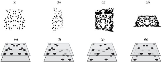 (a–d) shows the stimuli used in [], kindly provided by the first author, and (e–h) gives a schematic sketch of the stimuli used in []. (a) Frontoparallel dot pattern. (b) The same dot pattern rotated about the vertical midline (y-axis). The retinal symmetry is distorted because the virtual lines connecting dot pairs are neither midpoint collinear nor parallel. (c) Blob pattern rotated about the vertical midline. (d) Blob pattern rotated about the horizontal midline (x-axis). In this pattern, both midpoint collinearity and orientational uniformity of the virtual lines connecting symmetry pairs are preserved. (e–h) Schematic overview of the stereoscopic manipulations used in []. Each panel shows a view of two depth planes that, for illustrative purposes, have been tilted backwards. Also for illustrative purposes, the planes are half-transparent (they were fully transparent in the experiment) so that dots on the lower plane covered by the upper plane appear greyish. (a) Baseline stimulus. A perfect symmetry is shown on the first (upper) depth plane, with no information in the other depth plane. (b) Starting from the same pattern, symmetry is spread across two depth planes such that each symmetry half resides on a different depth plane. (c) Starting from the pattern in (a), symmetry is spread across two depth planes such that the pattern on each individual plane looks random. (d) Starting from the pattern in (a), symmetry is spread across two depth planes such that symmetric relationships are preserved within depth planes.