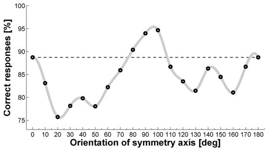 Symmetry processing is anisotropic with regard to the orientation of the symmetry axis. This was first noted by Mach [] and since then has been confirmed in further experiments [,]. Despite some incongruity across different studies, the general picture seems to be that there is a gradient of sensitivities to different axis orientations, with orientations close to the vertical being most salient, followed by horizontal, then left/right oblique, and finally all other axis orientations [,] (see Figure 5). Even infants as young as 4 months process vertical symmetry more efficiently than other orientations []. Importantly, these effects are probably not due to a vertical default frame of reference or due to the application of cognitive strategies, because cuing of the symmetry axis does not obliterate these anisotropies [].