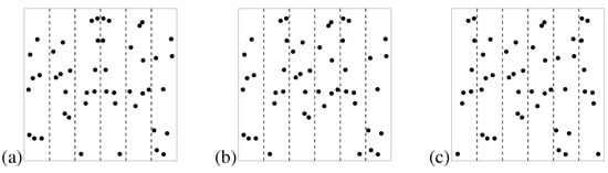 Position effects of symmetry information in a dot pattern. The pattern is split into three symmetric pairs of vertical stripes, with one pair containing symmetrically positioned dots and the other two pairs containing random dots. (a) Symmetry is centered around the symmetry axis. (b) Symmetry is confined to the second and fifth stripe. (c) Symmetry is confined to the outermost stripes.
