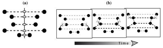 A number of different studies suggests that symmetry processing is directly involved in the grouping and segmentation of visual input. For instance, symmetry was shown to affect figure-ground segregation, one of the principal operations during object formation. In stimuli with ambiguous figure-ground arrangements, participants tend to perceive symmetric shapes as figure and asymmetric shapes as ground [,]. A recent study corroborated the involvement of symmetry in grouping by co-alignment []. The authors used a stimulus consisting of Gabor elements, some of which joined together to form the outline of a shape. Psychophysical thresholds for the detection of shape were measured by varying the degree of alignment of the Gabor elements. Thresholds were significantly lower when the shape was symmetric than when it was asymmetric. A powerful demonstration that symmetry is involved in the perceptual formation of objects was given by []. The study started from the well-known phenomenon of structure-from-motion (SFM), which implies that 3D volumetric structure can be perceived when dots move sinusoidally [,]. The usual percept is a 3D rotating cylinder (Figure 3b). However, if the moving dot pattern is 2D symmetric (as sketched in Figure 3a), novel interpretations can be perceived. Now it is also possible to see two disjunct surfaces moving in opposite directions (Figure 3c). This suggests that symmetry is directly involved in the definition of the perceived object.