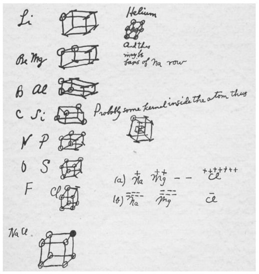 G. N. Lewis’s 1902 sketch showing valence electrons at the corners of cubic valence shells in atoms. Copied from Lewis [].