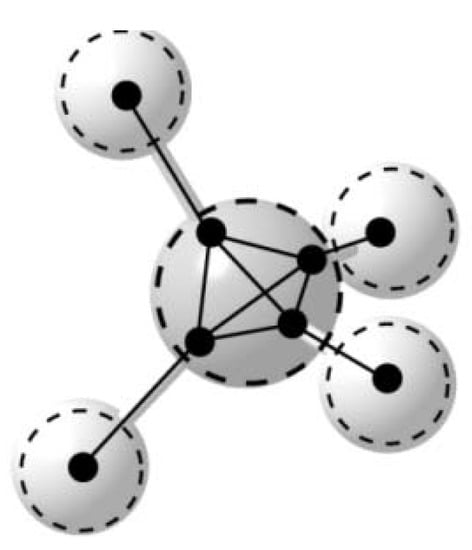 VIF picture for methane. Valency Points (VP), dots, represent valence orbitals, 1s for hydrogen and sp3 for carbon. Solid lines show interactions, energy or electron density.