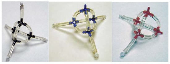 VIF molecular models of methane, ammonia, and water. Black, blue, or red pieces represent sp3 orbitals for C, N, or O, white pieces represent H1s orbitals and interactions represented with tygon tubing.