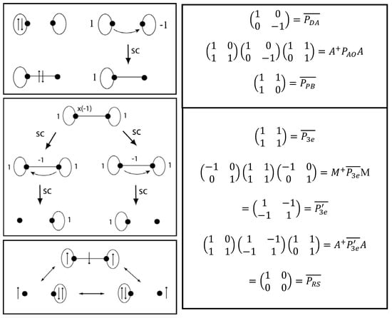Donor-acceptor bonding, three-electron bonding, and three-center boding have been significant in the development of bonding concepts [,]. Figure 7 shows sets of VIF resonance structures related by the pictorial rules (left) and their corresponding matrix transformations (right) for a donor-acceptor dative bond (top) and for a three electron – two center bond (bottom). The donor-acceptor bond is structurally covariant with covalent bonds. Compare Figure 5 with Figure 7. The three electron bond which has two bonding electrons and one antibonding electron from the MO point of view, Figure 5 (right), has structurally covariant resonance structures, Figure 7 (bottom left). Qualitative MO and VB approaches are known to be equivalent in this case [,]. These resonance structures look similar to three electron bond Valence Bond configurations of Green and Linnet [], and Harcourt [,,,] that result from delocalizing an A or B atom lone pair electron into the ΨAB bonding molecular orbital. (. Harcourt [] has also shown that the electrons on the A and B atoms will have parallel spin while the electron delocalized in ΨAB has the opposite spin. Using the notation of Green and Linnet and Linnet [], x and for electrons with opposed spins gives x. We will follow this result when filling electrons into the VIF picture. See Figure 7 (bottom left).