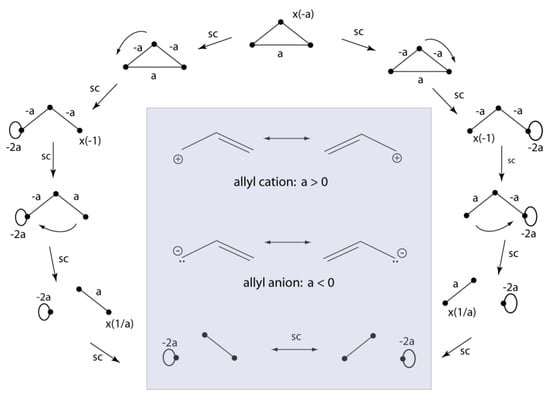 The two pictorial rules are used to relate resonance structures for the π-system ally cation, anion, and radical to the topology of the one-electron density matrix; a is positive for a cation, negative for an anion, and zero for the radical.