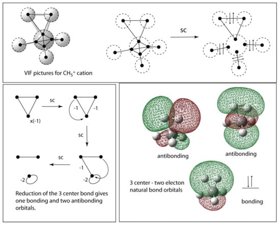 The VIF method is easily applied to describe the bonding in the methonium ion, CH5+. Figure 11 (top) shows the VIF picture for the CH5+ ion. The two rules applied as they were in the case of methane lead to three two center — two electron bonds and a three center two electron bond. Figure 11 (bottom left) shows how the VIF picture for the three center bond is reduced to an antibonding orbital and two VP connected by a VI which, as we have seen in Figure 5 and Figure 6, is further reduced to one bonding and an additional antibonding orbital. The three center bond in CH5+ leads to one doubly occupied bonding orbital and two unoccupied antibonding orbitals. See Figure 8. The natural bond orbitals, NBOs, for the three center — two electron bond in CH5+ are also shown in Figure 11 (bottom right). These were calculated using Gaussian 03 for Windows [] and the NBO options [] included with this suite of programs. The 3c-2e bond presents difficulty for conventional Lewis structures but not for VIFs.