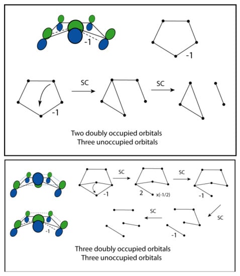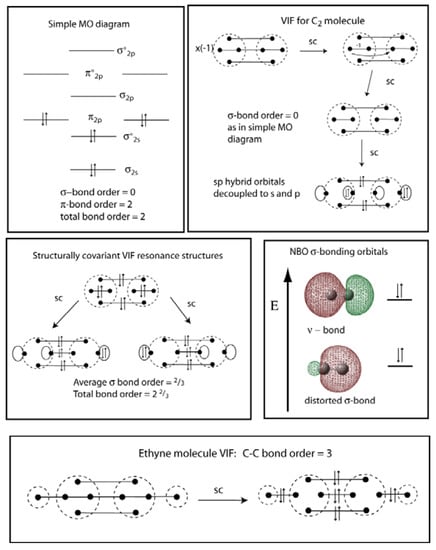 The VIF treatment for C2 is shown in Figure 12 (top right). Notice that each of the carbon centers was given sp hybridization and no electronegativity loops are needed. The σ-bond interaction in the initial VIF for C2 is immediately canceled using the rules, consistent with the simple MO diagram. See Figure 12 (top left). Jug [] using his Maximum Bond order Principle finds C2 to have a triple bond, in agreement with the fact that the C2 bond length is close to that of acetylene.