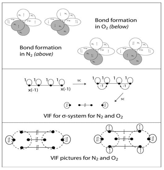 Orbital interaction diagrams are shown for bond formation in N2 and O2 molecules (top). The σ-system for these molecules consists of four sp hybrid orbitals and six electrons. The VIF picture for the σ-systems reduces to a σ-bond and lone pairs on either end (middle). Including π-bonds with electrons filled in yields expected bond orders and spin multiplicities in each case.