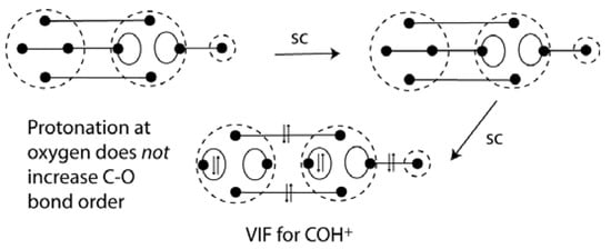 Carbon monoxide is both a familiar and an unusual example with its exceptionally strong bond, Do298 = 1076.5 ± 0.4 kJ/mol [], and small dipole moment. The electron configuration for the symmetry allowed formation of the CO bond is shown in Figure 14 (top). The VIF picture for carbon monoxide requires electronegativity loops for oxygen but not for carbon. See Figure 14 (middle) The sp hybrid orbitals on oxygen are constructed from the doubly occupied 2s and 2p orbitals. αsp = (2+2)/2 = 2 and βsp = (2-2)/2 = 0. The loop constants for the oxygen sp orbitals are ξ = (2-1) = 1 and there is no intrahybrid interaction since βsp = 0. Reduction of the VIF picture for carbon monoxide correctly shows that all ten valence electrons are in bonding orbitals.  The σ-bonding interaction is a donor-acceptor interaction or dative bond. The dative bond notation for carbon monoxide was shown as early as 1931 by Sidgwick []. The VIF picture for HCO+ shows that the bond order increases when protonation at carbon occurs. See Figure 14 (bottom). There is no such increase in bond order indicated with protonation at oxygen. See Figure 15. The effects on C-O stretching frequency of protonation at the carbon or oxygen in CO are consistent with the increase in C-O bond order n HCO+ but not COH+. See Frenking [].