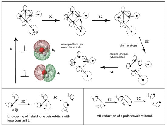 The VIF picture for a water molecule with sp3 hybridized oxygen includes electronegativity loops on oxygen. Application of the two rules leads to two polar covalent bonds and hybrid lone pair orbitals which are decoupled to lone pair molecular orbitals with a1 and b1 symmetry (top). The rules are used to decouple the lone pair orbitals and reduce the polar covalent bonds (bottom). The loop constant has a value of .