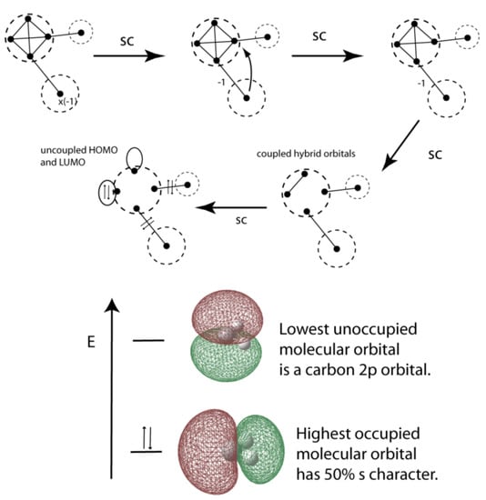 If The VIF picture is a one-electron density operator, line constants are calculated based on average s and p orbital electron occupations using αspn = (αs + nαp)/(n+1), βspn = (αs – αp)/(n + 1), and loop constants ξspn = (αspn – 1 )/βspn, and line constants κspn = βspn/βspn = 1. Hybridized carbon centers, with an average of one valence electron per valence orbital and ξspn = (αspn – 1) = 0 have no loops. The VIF pictures for hybridized carbon centers are shown in Figure 9. The carbon sp3 VIF picture in Figure 9 is a representation of the ground state electron configuration of a carbon atom with averaged p-orbital occupations that has been transformed into a hybridized orbital frame. It does not represent a quartet of electrons as in Linnett’s theory []. There is therefore no promotion energy in this approach. When the VIF picture is a one-electron Hamiltonian operator, line and loop constants are calculated with αs and αp as valence orbital ionization energies, VOIE.