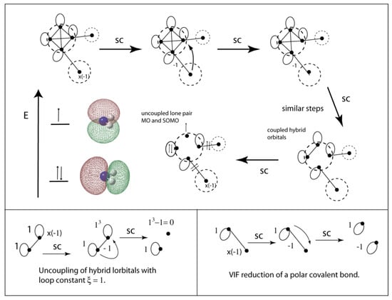 Figure 16 (bottom left) shows the decoupling of the sp3 lone pair orbitals using the two rules. The loop constant has a value ξ = 3 so both lone pair orbitals are doubly occupied and lower in energy than the refrence −½ Eh []. Figure 16 (bottom right) shows polar covalent bonds reduced to one doubly occupied and one unoccupied orbital or in terms of energy a bonding MO and an antibonding MO.