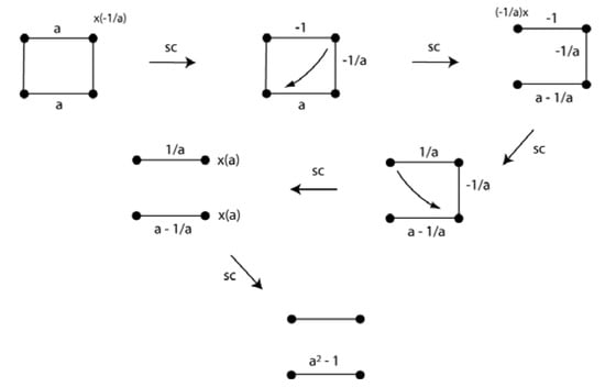 The benzene and other unsaturated and saturated hydrocarbons have had a special role in the development of the molecular structural formula and application of chemical bonding theories. The VIF method has been used to predict the π-distortivity of benzene, distinct single and double bonds in cyclobutadiene, and symmetries of cyclopentadienyl cation, radical, and anion []. The consideration of relative interaction energies is important in these cases and a formula relating the effect of relative interaction strength to the number of carbon atoms in σ-ring systems has been derived []. Figure 21 shows the reduction of the VIF for the π-system of cyclobutadiene. The constant, a, is used to test the relevance of alternating interactions of different strength around the ring. Application of the two rules yields two segments. If a = 1 as would be the case for a square, D4h symmetry for the molecule, then from the point of view of electron density, there are two unpaired electrons or from the point of view of energy, there are two degenerate molecular orbitals which result in a triplet state according to Hund’s rule when the 4 π-electrons are filled in. The singlet state with a pair of doubly occupied π molecular orbitals is therefore Jahn-Teller distorted as is well known.