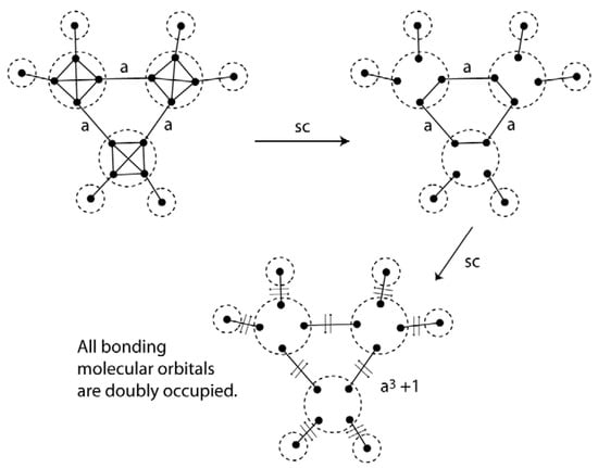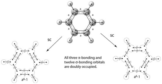 The same approach can be used for σ-systems. Figure 23 shows the VIF method applied to cyclopropane. The relative interactions, strength a, indicate the difference in strength of sp3 carbon intrahybrid interactions and σ-bonding interactions around the ring. The constant a is greater than 1 so one concludes that all of cycloproprane’s valence electrons are in doubly occupied molecular orbitals. No assertions need be made about σ-aromaticity []. When VIF is applied to σ-systems of hydrocarbon rings, the last interaction has strength of an + (−1)(n–1) []. This formula can be applied quickly and easily to larger ring systems. The VIF results for benzene are shown in Figure 24. Using the formula from above, the last σ-interaction has strength of a6 − 1. Since a > 1, all of benzene’s valence electrons are paired in bonding molecular orbitals. The two benzene resonance structures are structurally covariant because they are related by the two pictorial rules.