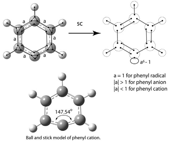 A similar increase in bond angle is found in the double aromatic [] C6H3+ cation. The VIF treatment of the σ-system for this cation is shown in Figure 26. The carbon atoms with hydrogen atoms attached are given sp hybridization. The unhybridized p-orbitals in the σ-plane interact to form the three centered — two electron bond. The remaining σ-system is reduced using the an  + (−1)(n–1) rule and the π-system is the same as for benzene. The CCC bond angles centered on the carbon atoms without hydrogen are 149.4° according to B3LYP/6-311++Gdp.