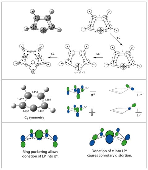 An unusual molecule with a high degree of distortion and low degree of symmetry, C1, is singlet cyclopentadienylidene. One may wonder whether the singlet state of this neutral carbene with formula C5H4 will be π-aromatic with 6 π-electrons and the empty orbital in the sigma plane or π-antiaromatic with 4 π-electrons and the carbene lone pair in a σ-lone pair orbital stabilized with a higher degree of s-character. Frenking [] using the EDA analysis considers cyclopentadienylidene to be antiaromatic, a classification that in itself does not explain the puckering and twisting of the ring to give C1 symmetry. The cyclopentadienyl cation with its 4π electrons is planar though JT distorted in the plane.
