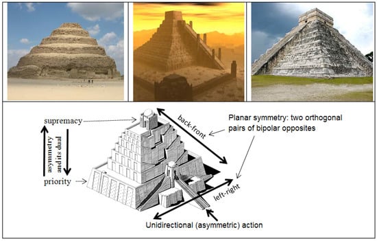 Bourbaki’s mother forms—linear asymmetry, two-dimensional and bipolar symmetry, and vertical hierarchy as a sequence of steps—were prefigured in one of the earliest artistic archetypes: the first pyramid constructed by the prime minister and physician Imhotep (author of the first medical (and scientific) textbook, identified with Asclepius by the Greeks and the Romans), the Ziggurats built by the Sumerians, Elamites and Assyrians, and the step pyramids built by the Mayans, Mexicans and Incas (figure 1).
