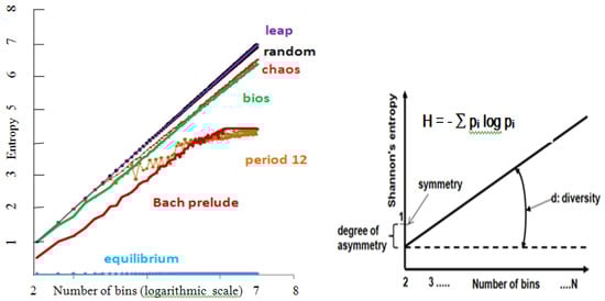 Entropy-bin plot. Plot of informational entropy as defined by Shannon. It shows the calculation of the degree of symmetry (entropy at 2 bins = 1 for perfect symmetry and less than 1 for asymmetry) and diversity (slope). Many natural and human processes are highly asymmetric. Biotic series and random walks have a small degree of asymmetry, while chaos, random, and periodic series are symmetric.