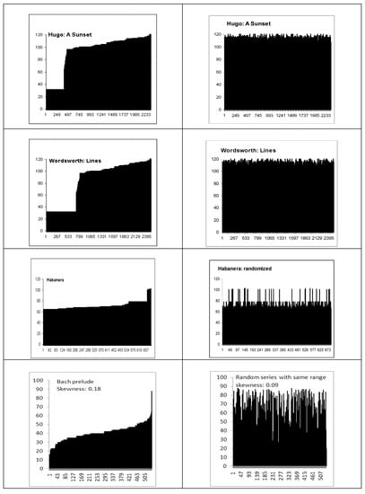 Table 2 shows that maximal entropy occurs for ordered series such as a sequence of linearly increasing numbers, not for random data, as often assumed. Musical and literary texts have relatively low entropy. Figure 9 shows that this low entropy results from low symmetry rather than from decreased diversity. Both of these results are also observed in biotic series generated mathematically as well as in natural processes.