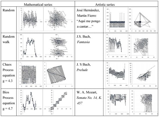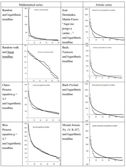 The data presented in the figures above are time series and therefore have no physical dimensions. We analyzed the sequence of notes in musical scores and the sequence of letters in literary texts in English and Spanish. The data were compared with mathematical models of non-periodic variations: random series, random walks, and stationary Chaos and non-stationary Bios generated by the process equation [] (figure 2) for g = 4.3 and 5.